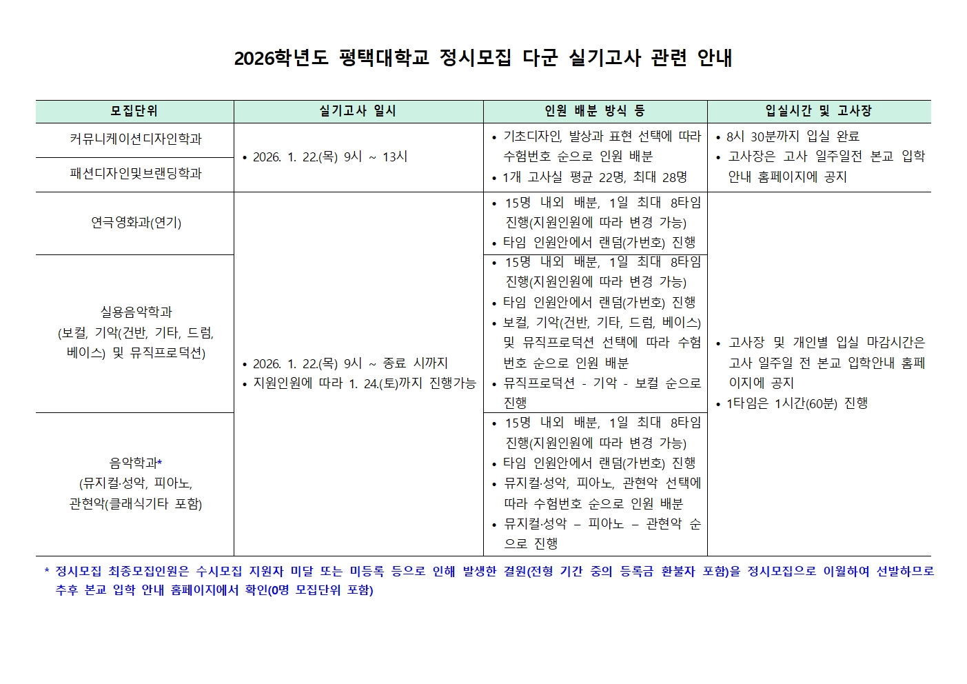 fnctId=bbs,fnctNo=255 글번호 32555 2026학년도 정시모집 다군 실기고사 관련 안내 수정일 2025.12.24 작성자 윤이슬 조회수 208 등록일 2025.12.24 첨부파일 첨부파일이(가) 없습니다. 이전글 2026학년도 편입학모집 모집인원(일반편입) 안내 송민희 2025-12-22 20:00:00.0 다음글 2026학년도 정시모집 원서접수 안내 윤이슬 2025-12-24 14:00:00.0