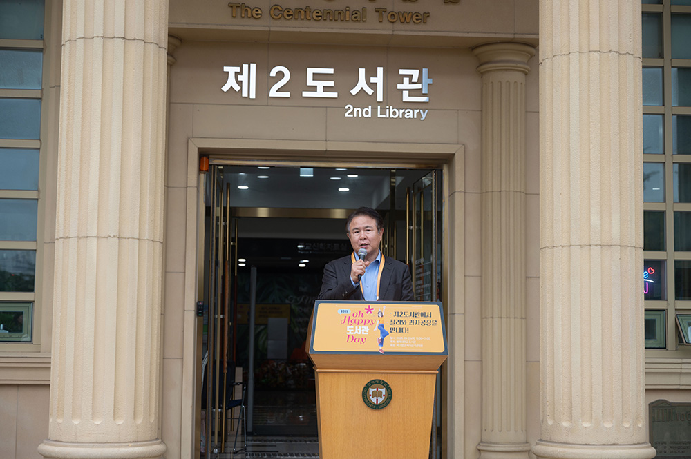 박현규 도서관장은 인사말을 통해 "지난 몇 년간 '세상에 없는 도서관'을 목표로 완전히 탈바꿈시키고자 노력해왔다"며, 도서관이 '실내 정숙'을 넘어 라키비움, 인권도서관, 정년이 드림존, 빈백존, 모래멍존, 오해피존(생일 파티 공간), 뷰가 있는 열람석 등 활기찬 공간으로 변화했음을 강조했다. 또한, 앞으로도 학생들의 행동과 관계를 깊이 연구(에스노그라피)하여 진정으로 필요로 하는 공간과 프로그램을 만들겠다고 약속했다.