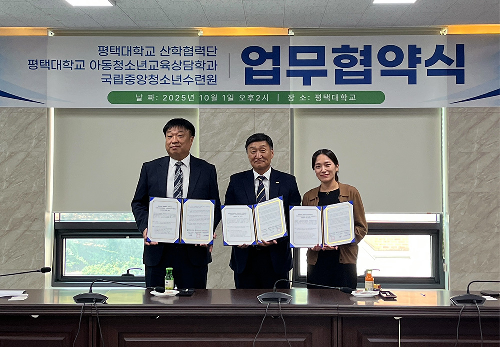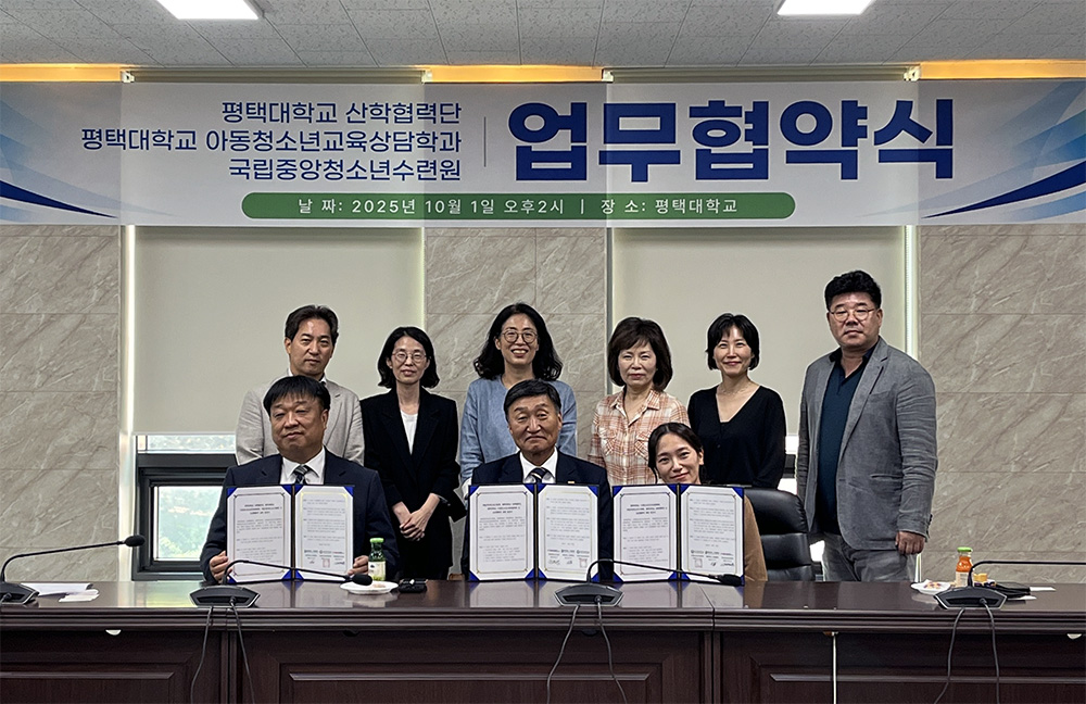 평택대학교 아동청소년교육상담학과(학과장 김윤경)는 10월 1일(수), 미래 사회가 필요로 하는 인재육성과 일자리 창출 등 상호발전을 위한 협력체계 구축을 목적으로 국립중앙청소년수련원(원장 정철상)과 업무협약(MOU)을 체결하였다.