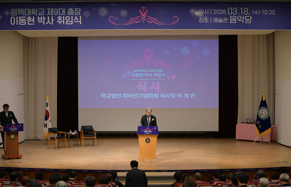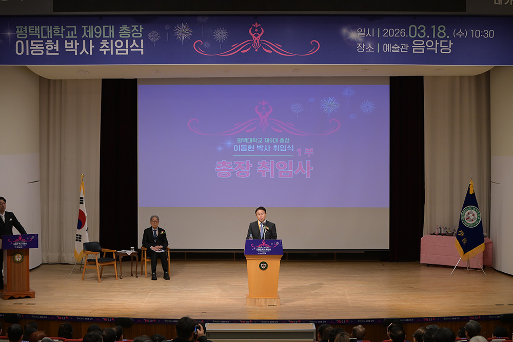 평택대학교(총장 이동현)는 3월 18일(수) 교내 예술관(음악당)에서 제9대 총장 이동현 박사 취임식을 개최하고, 대학의 새로운 도약을 선언했다. 이날 취임식은 “새로운 도약, PTU will RISE UP”이라는 비전 아래 진행되었다.