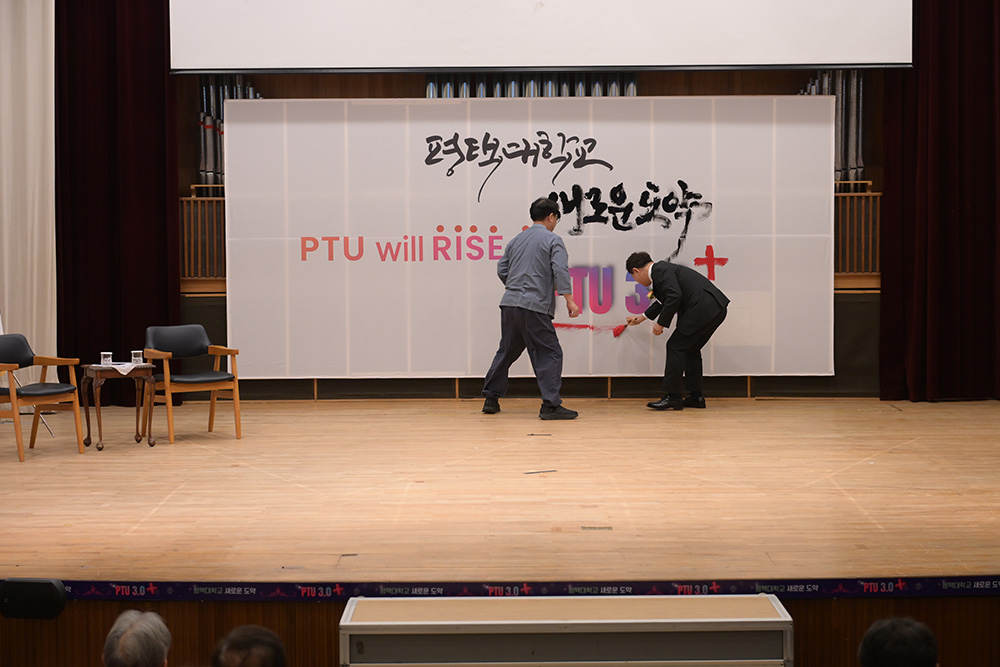 특히 ‘평택대학교, 새로운 도약’이라는 주제로 진행된 캘리그라피 퍼포먼스는 참석자들의 이목을 집중시켰다. 이번 퍼포먼스는 본교 총무처장이자 오랫동안 캘리그라피 작가로 활동해 온 박종민 처장이 직접 붓을 잡았으며, 대학의 비전을 함께 완성한다는 의미를 담아 총장이 무대 위에서 직접 참여하며 감동을 더했다. 힘찬 필치로 완성된 이 작품은 평택대학교의 오늘을 기록하고, 더 높이 비상할 내일을 상징하는 기념물로서 교내에 영구 보전될 예정이다.